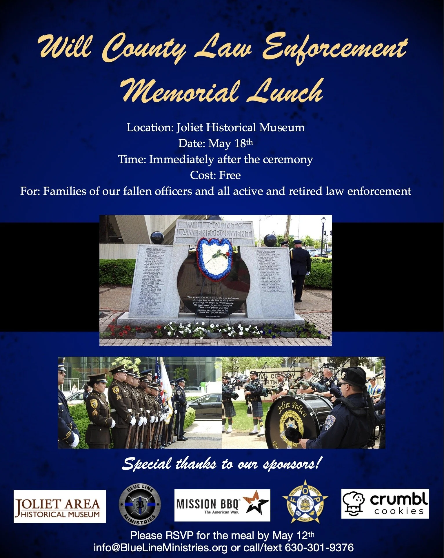 To be an encouragement to the families of the fallen, I have organized a lunch immediately after the memorial. The lunch is open to all retired and active law enforcement. I encourage you to attend and support these special families. The meal will be at the Joliet Historical Museum and will include a wonderful spread provided by Mission BBQ. Even if you are on duty and have a limited amount of time, feel free to stop by and grab a quick bite.